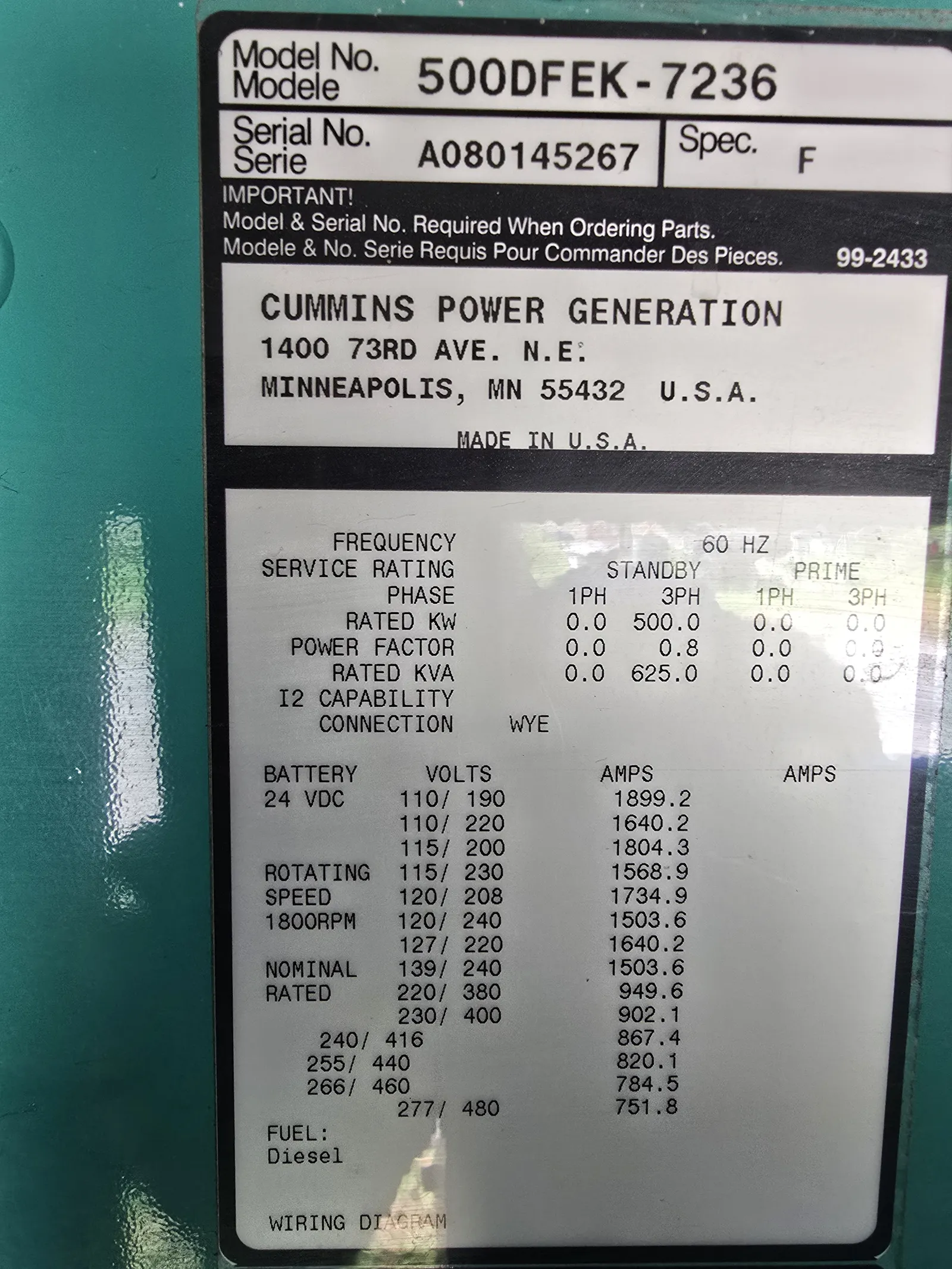| Generator End Serial # | A080145267 |