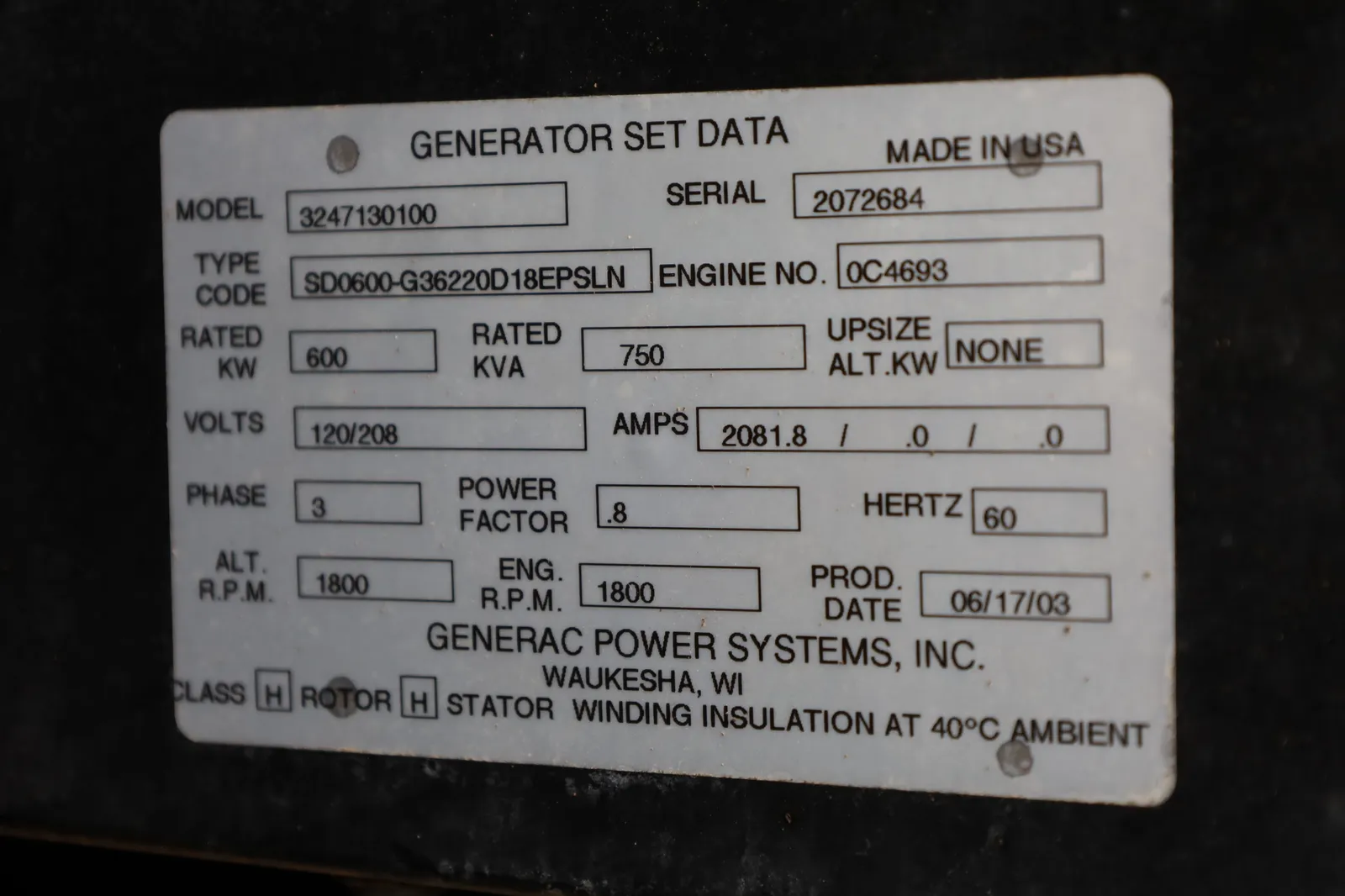| Generator End Serial # | 2072684 |