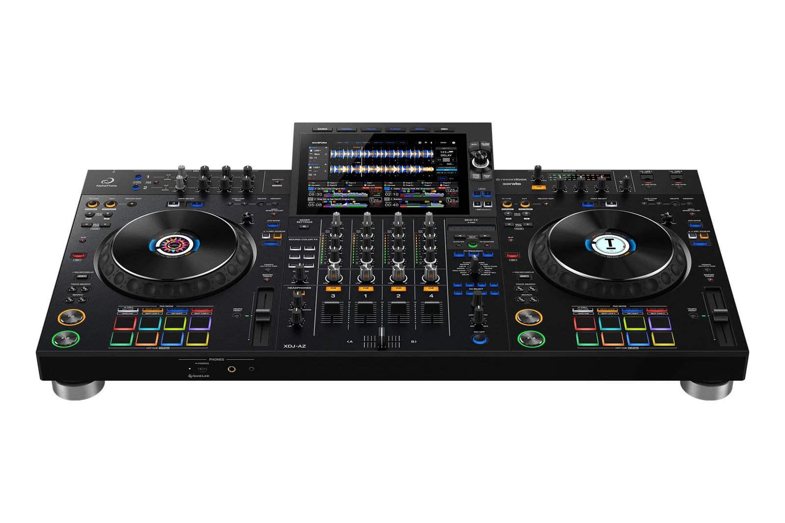 Thanks to the integrated SonicLink transmitter, you can enjoy ultra-low-latency wireless monitoring with the HDJ-F10 professional DJ headphones. Press a single button to pair the XDJ-AZ with the headphones and you can move around the DJ booth or stage freely, knowing you’ll never tangle or pull on a cable. SonicLink is AlphaTheta’s own proprietary ultra-low-latency wireless technology. It transmits audio 20 times faster than the commonly used Bluetooth® SBC codec, so, you’ll never notice a delay between pressing a button or scratching with the jog wheels and hearing the sound from the output.