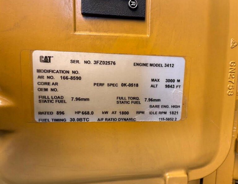 Used CAT 3412C Generator Set; 2001 Model – 428 Hours; 600kW Standby Rated; 480/277V; Sound Attenuated Enclosure; EMCP 2 Controller; Breaker; Jacket Water Heater; Battery Charger; Cleaned, Serviced, Load Tested