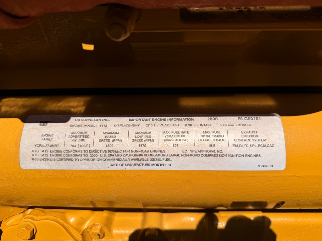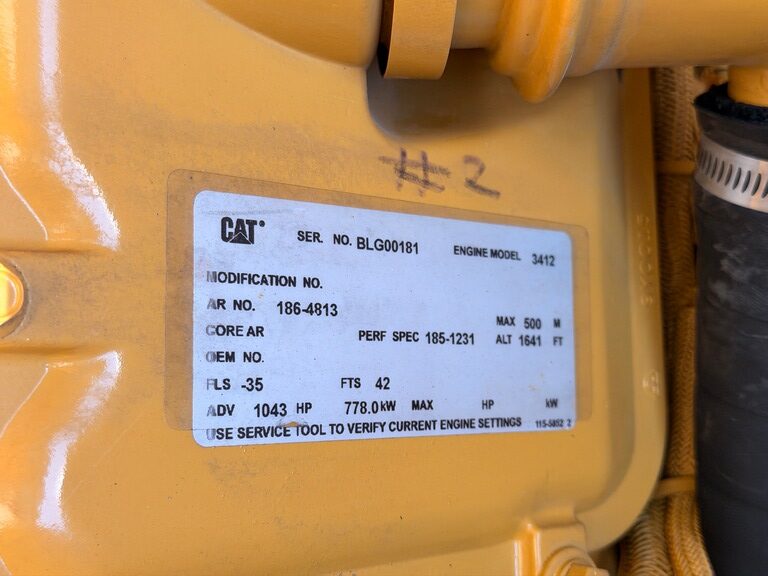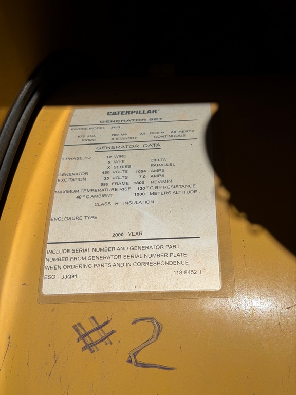 Used CAT 3412C Generator Set; 2000 Model – 496 Original Hours; 700kW Standby Rated; 480/277V; Weather Enclosure; Base Fuel Tank; EMCP 2 Controller; Breaker; Jacket Water Heater, Battery Charger; Three Matching Units Available; Exterior Repainted – Cleaned – Serviced – Load Tested