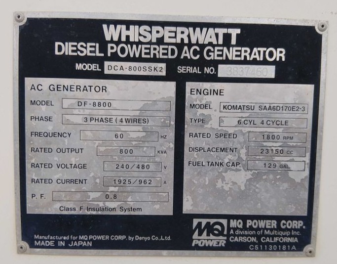 Used Multiquip DCA800SSK Generator Set; 2009 Model – 12,795 Hours; 640kW Prime Power; Multi-Voltage; Sound Attenuated Enclosure; Base Fuel Tank; Analog Controls; Circuit Breaker; Tier 2 Emissions; Trailer Mounted; Cleaned, Serviced and Tested
